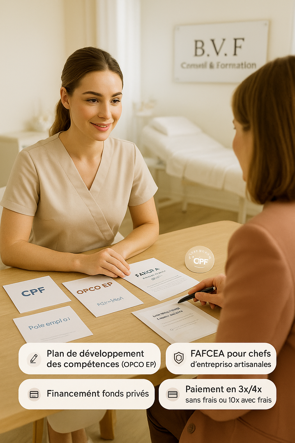B.V.F Conseil & Formation vous propose des formations qui s’adaptent Ă vos besoins. Nous avons Ă©tĂ© les 1 ers dans notre secteur EsthĂ©tique Ă vous proposer des 2013 des parcours d’expertises alliant le prĂ©sentiel en groupe de 6 stagiaires avec des visios ET un accompagnement individuel en tĂ©lĂ©-presentiel pour une mise en pratique rapide et personnalisĂ©e de la formation.